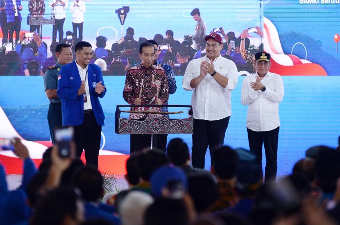 Menteri Pemuda dan Olahraga Republik Indonesia (Menpora RI) Dito Ariotedjo mendampingi Presiden Joko Widodo membuka rapat kerja nasional (Rakernas) Gerakan Angkatan Muda Kristen (GAMKI) Tahun 2023 di Lapangan Benteng, Medan, Sumatera Utara (Sumut), Sabtu (19/8).