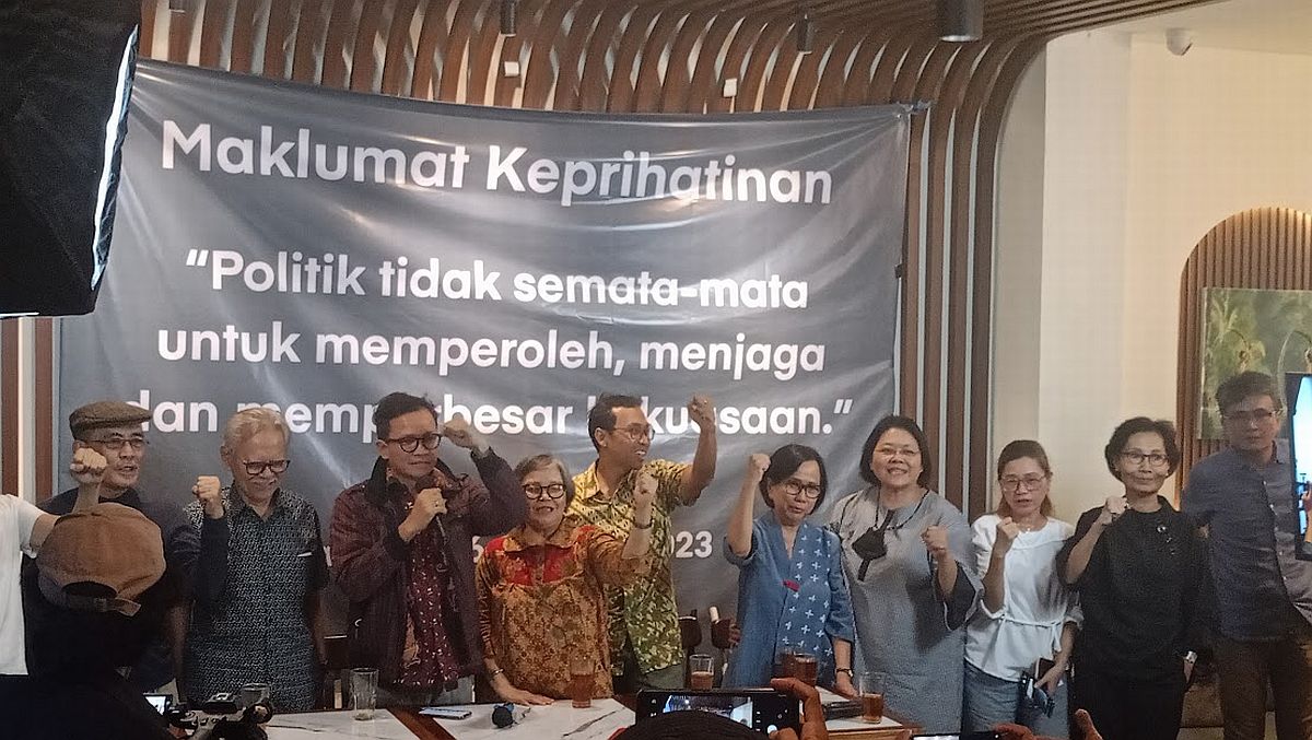 Maklumat Juanda dibacakan di Jalan Juanda, Jakarta Pusat, pada Senin (16/10/2023). Disebutkan lebih dari 200 warga Indonesia yang berasal dari kalangan tokoh bangsa, guru besar, seniman, aktivis hingga relawan Jokowi menyepakati maklumat tersebut. Mereka menyoroti perilaku elite politik dalam proses pemilihan presiden dan pemilihan umum 2024 yang mengabaikan kepatutan politik.
