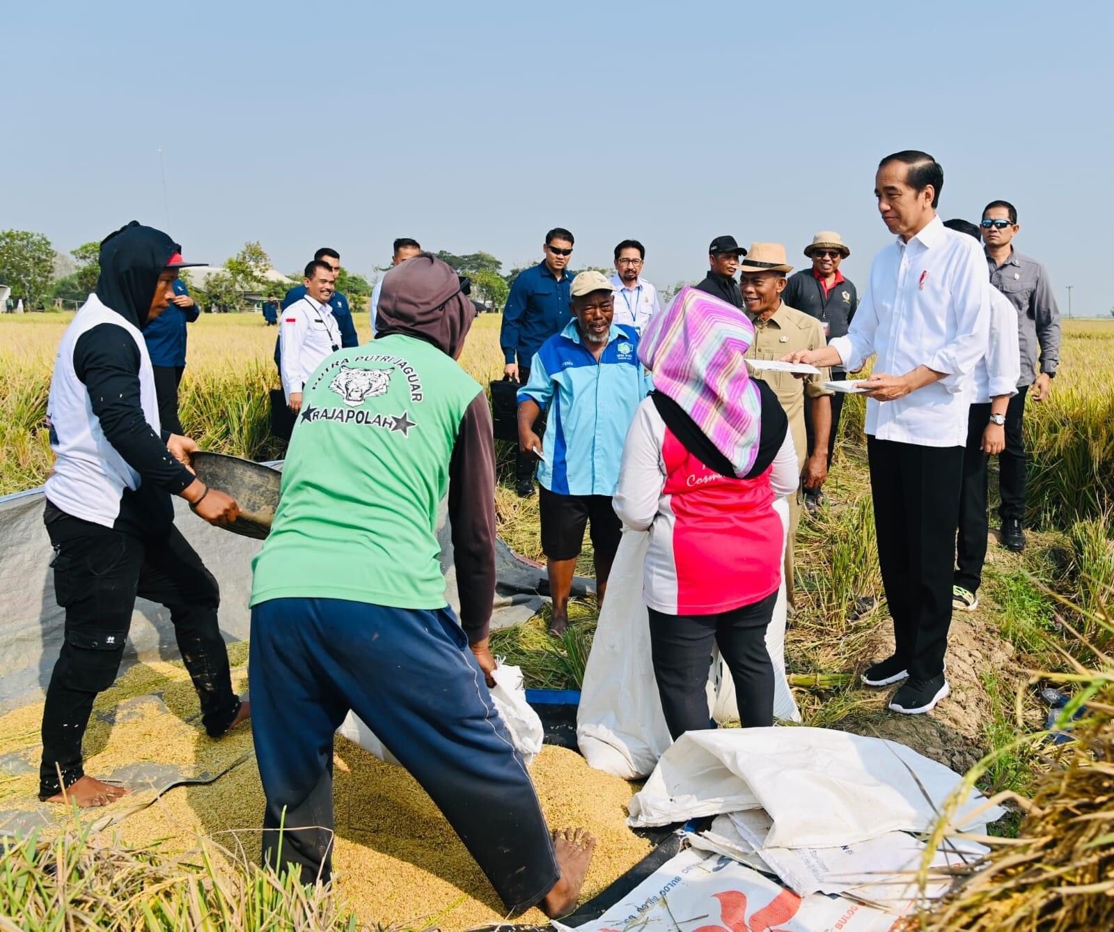 Presiden Joko Widodo mengikuti panen raya padi di Desa Ciasem Girang, Kabupaten Subang, Provinsi Jawa Barat, pada Minggu pagi, 8 Oktober 2023. Dalam keterangannya selepas panen, Presiden Jokowi berharap panen semester kedua tahun ini yang dilaksanakan di beberapa daerah dapat menambah pasokan cadangan beras nasional.
